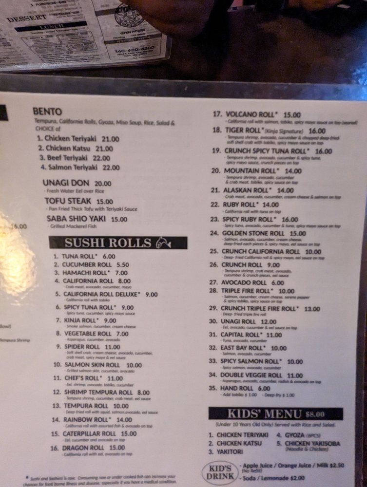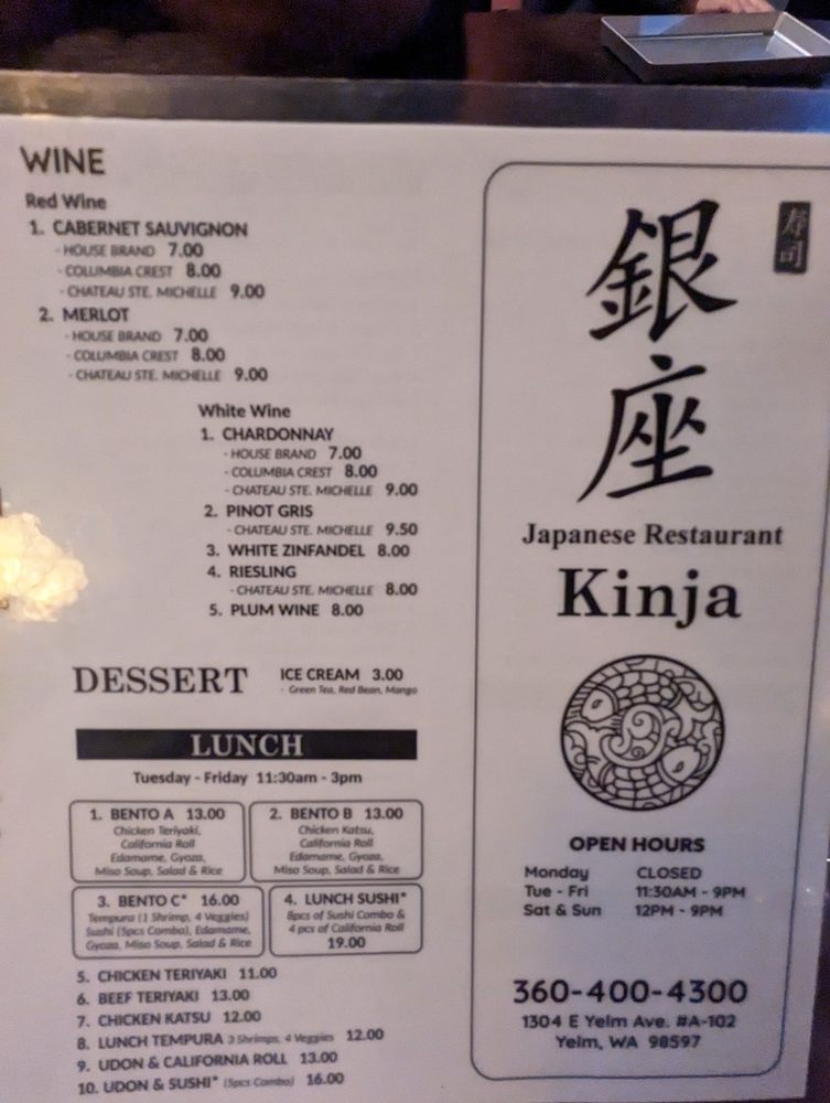 Introducing the menu at Kinja Japanese Restaurant, a top choice for Japanese cuisine and sushi bars in Yelm, WA. With a casual yet elegant ambiance, Kinja offers a variety of options for both sushi enthusiasts and those looking for Asian fusion dishes. Customers rave about the fresh and delicious sushi rolls, including favorites like vegetable tempura and yellowtail shashimi. The bento boxes with beef and chicken teriyaki are also highly praised for their flavorful taste. The friendly staff ensures a pleasant dining experience, whether you're dining in or ordering takeout or delivery. With options for groups, families, and kids, Kinja Japanese Restaurant is the perfect spot for lunch or dinner. Be sure to try their signature rolls and bento boxes for a taste of authentic Japanese cuisine.